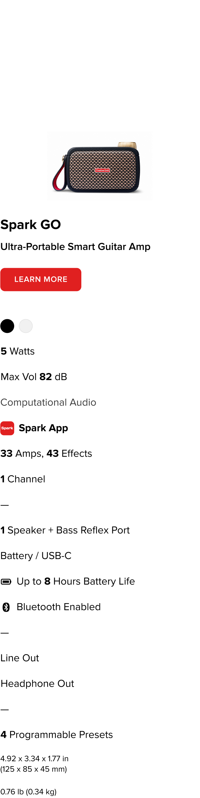A mind-blowing portable powerhouse, Spark MINI delivers innovative, customizable smart guitar playing to go. With multi-dimensional high-quality sound, a treasure trove of amps and effects, Smart Jam, video creation, and Bluetooth® audio streaming, it’s the biggest smallest rig ever.